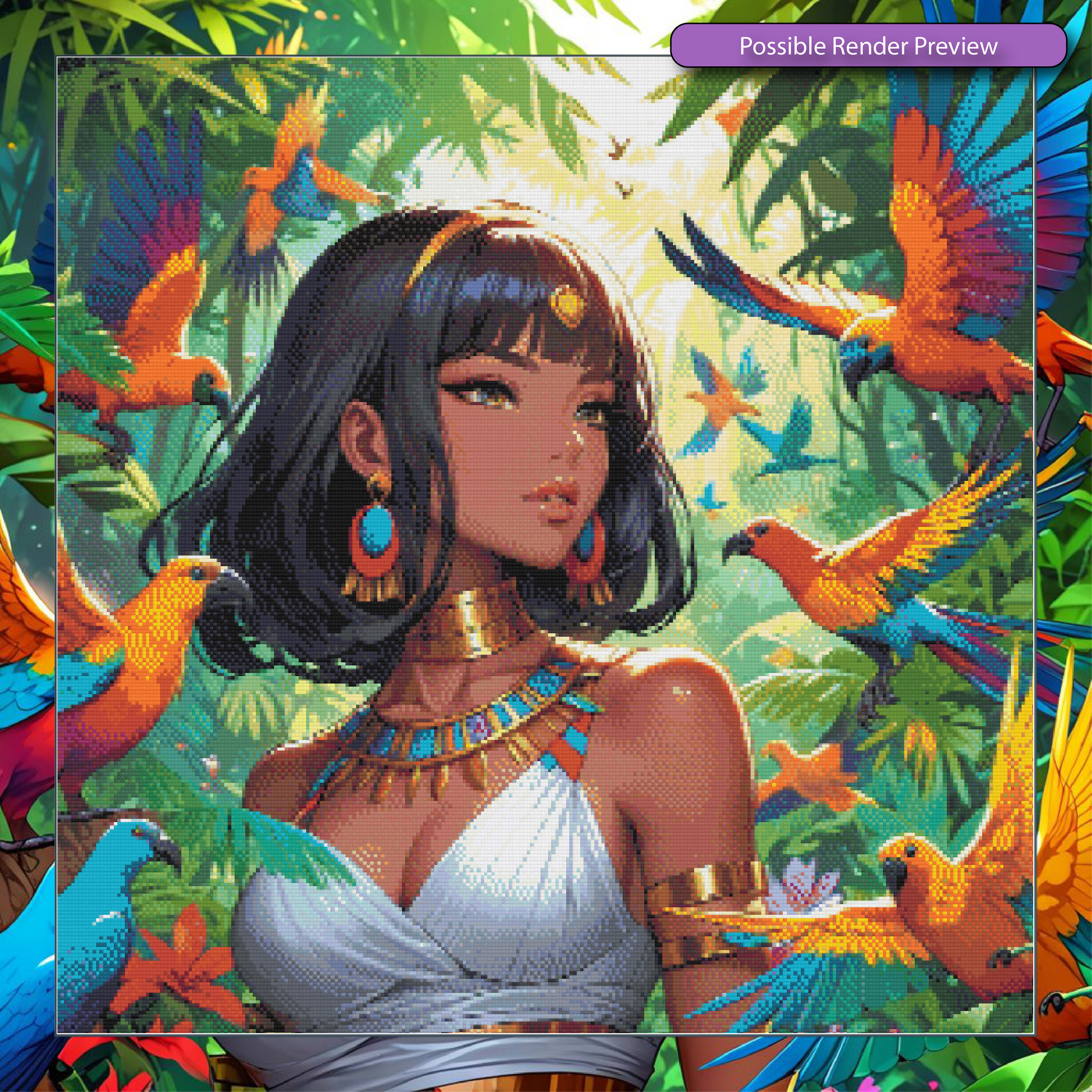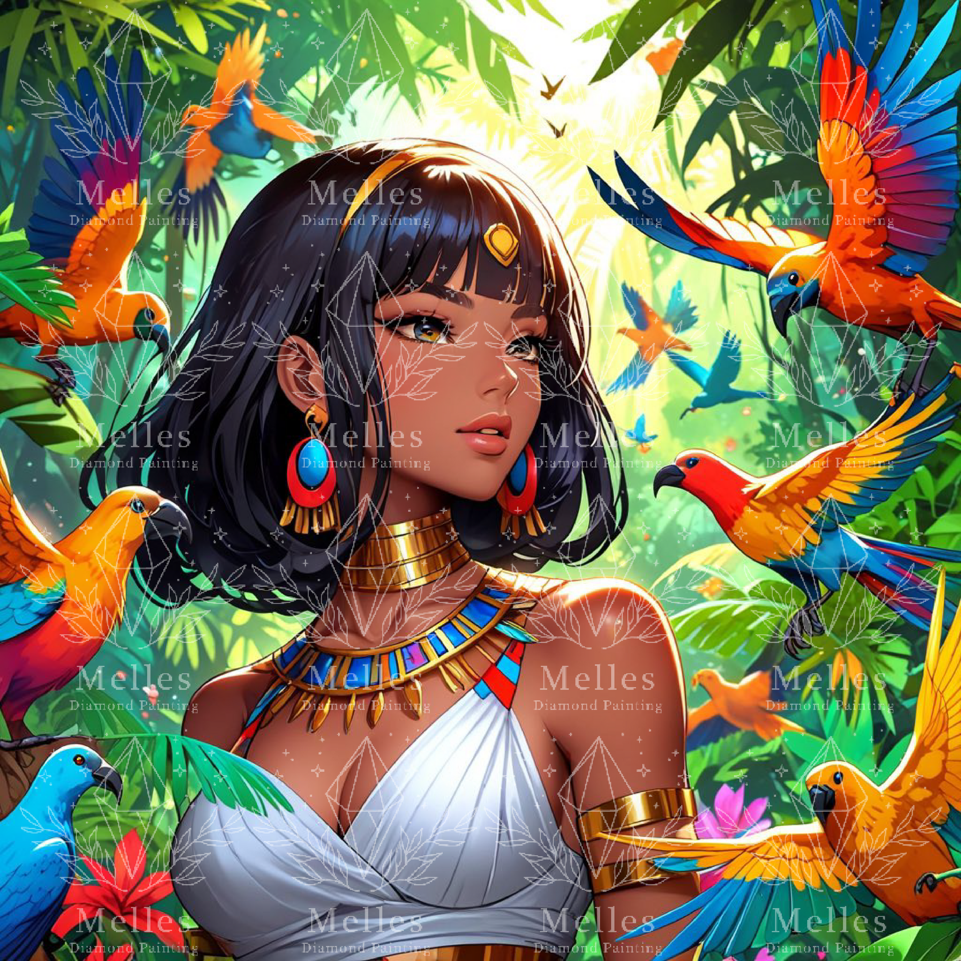A radiant queen adorned with golden jewels, surrounded by a symphony of vibrant tropical birds, embodying the spirit and majesty of the jungle.