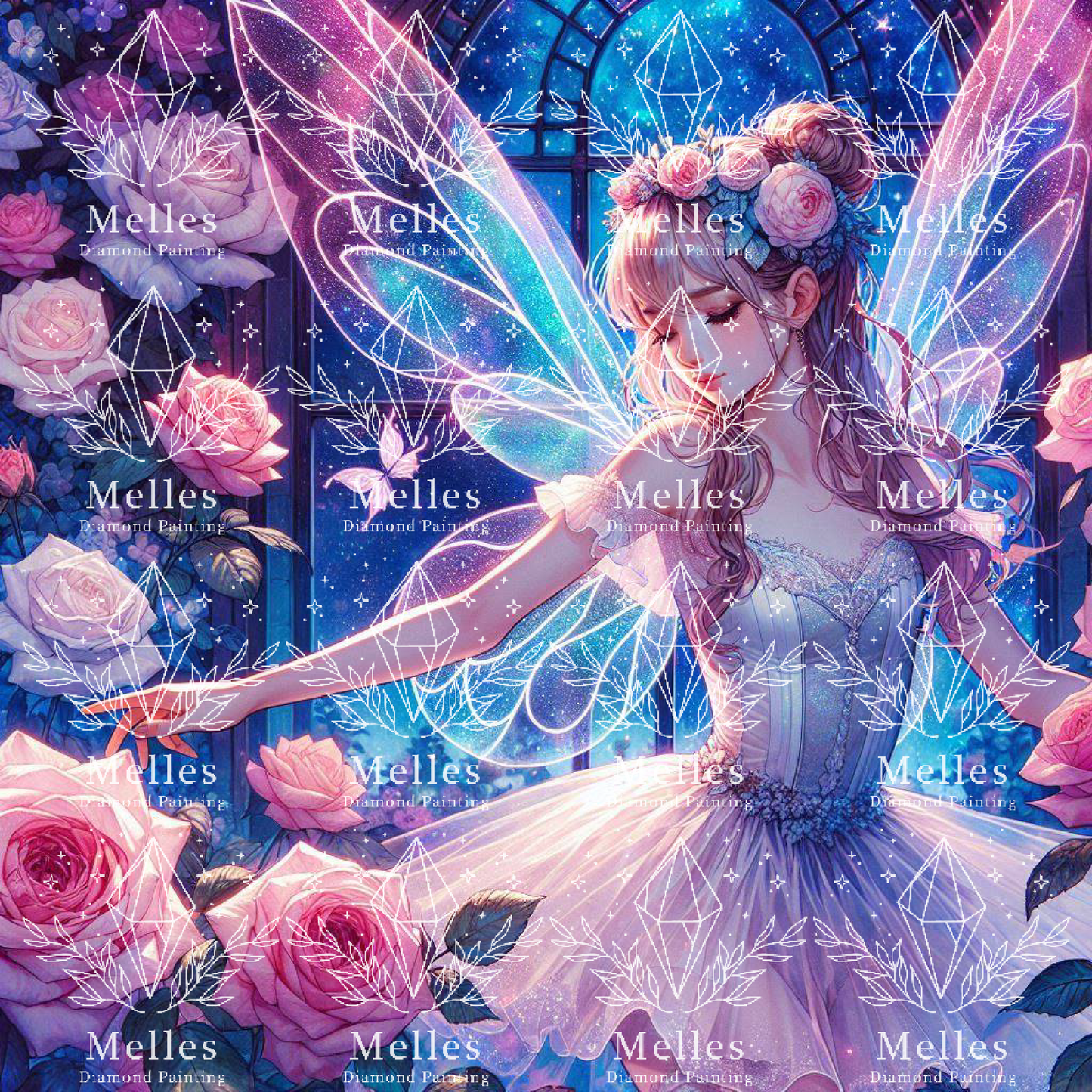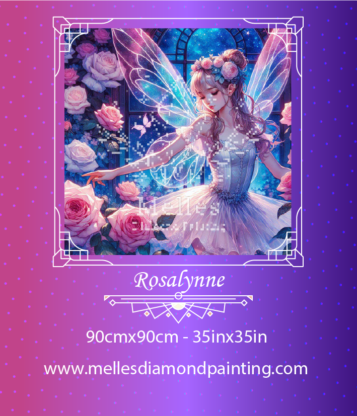 In the quiet of moonlit glass gardens, Rosalynne twirls through blossoms in full bloom, her wings glimmering with constellations. Born from a wish upon a midnight rose, she is both grace and guardian—blessing the garden with whispers of beauty and calm.