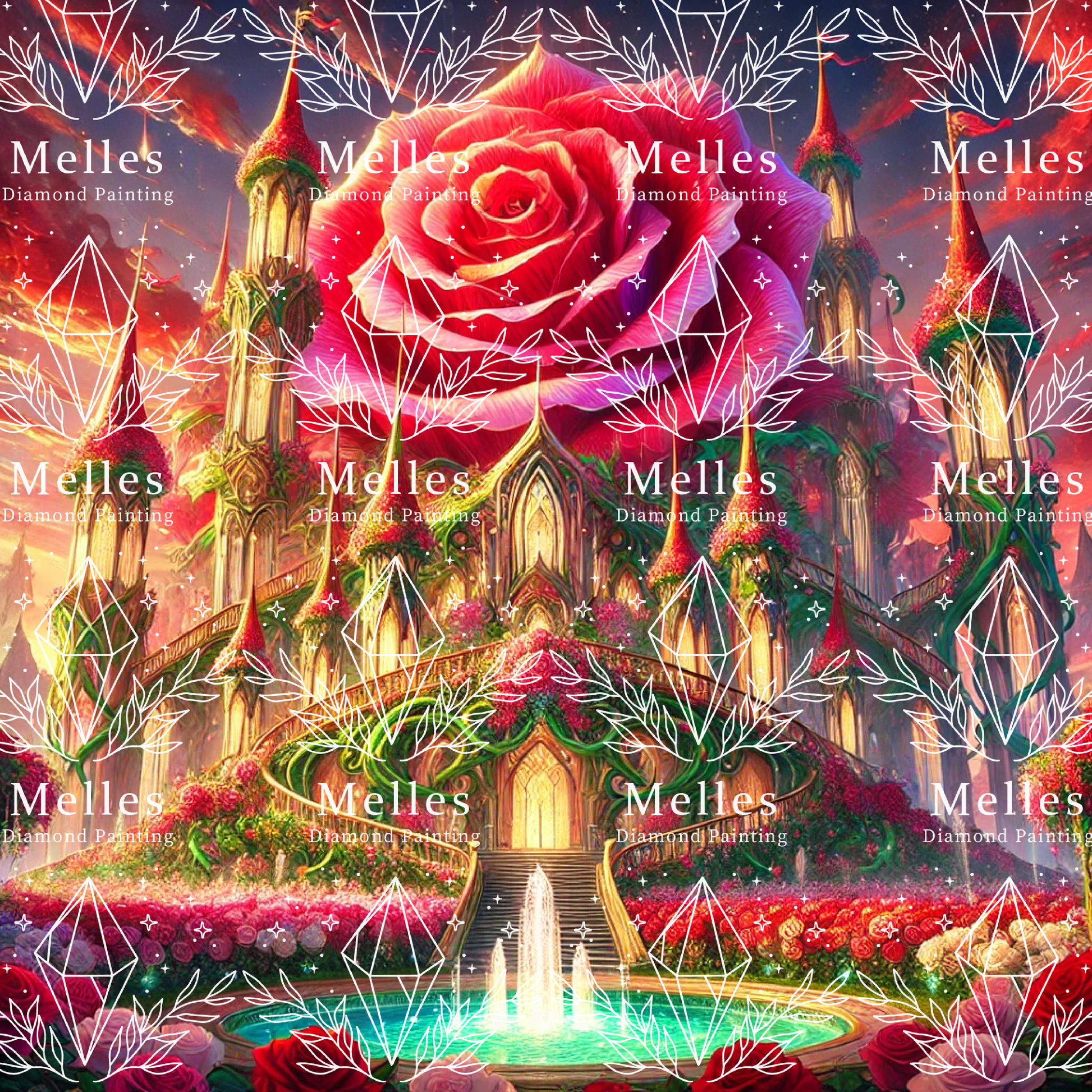 Step into a breathtaking fairy-tale wonderland with Rose Castle! This mesmerizing diamond painting captures the grandeur of an enchanting castle adorned with cascading roses and crowned by a colossal blooming rose at its peak.