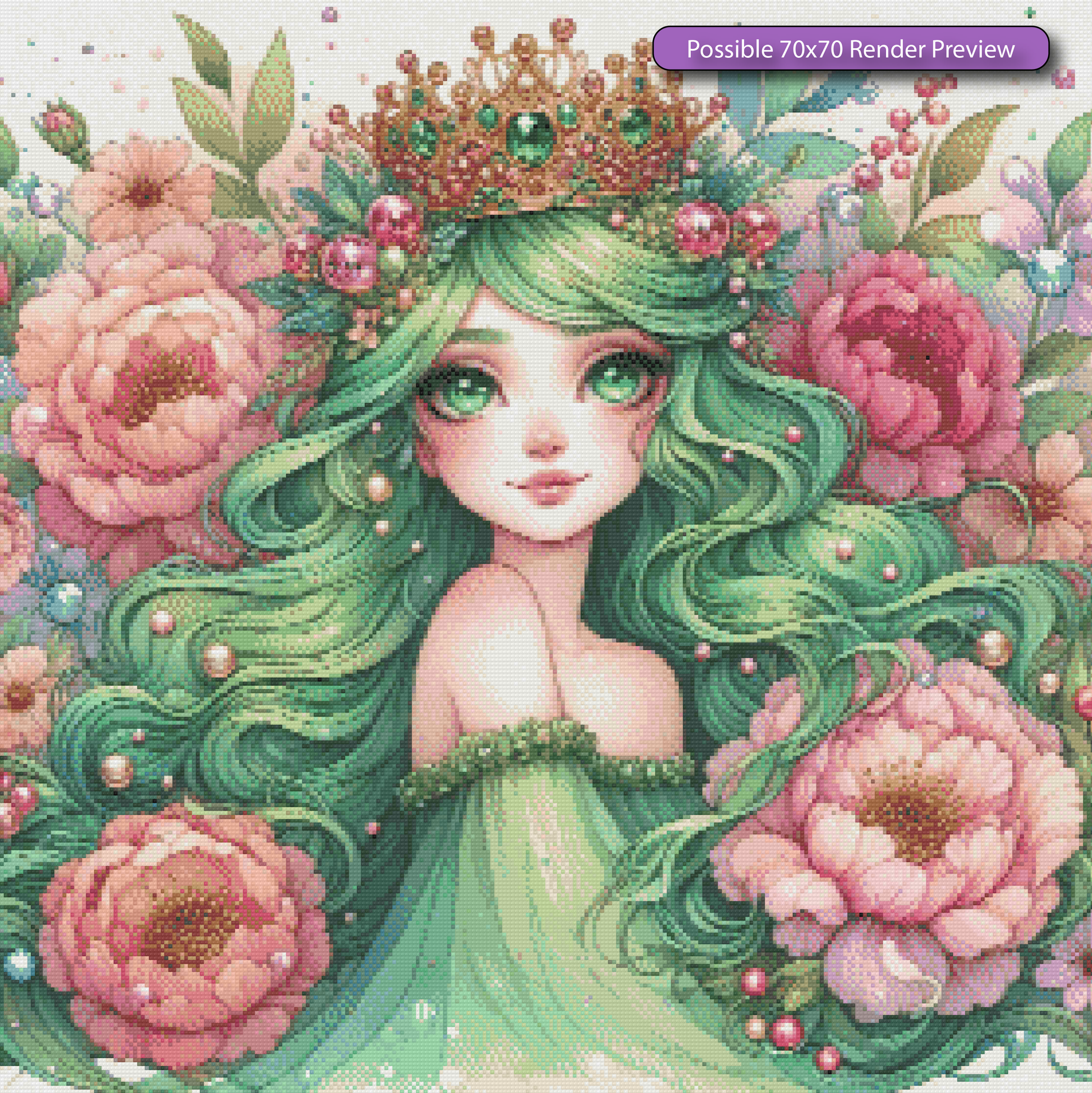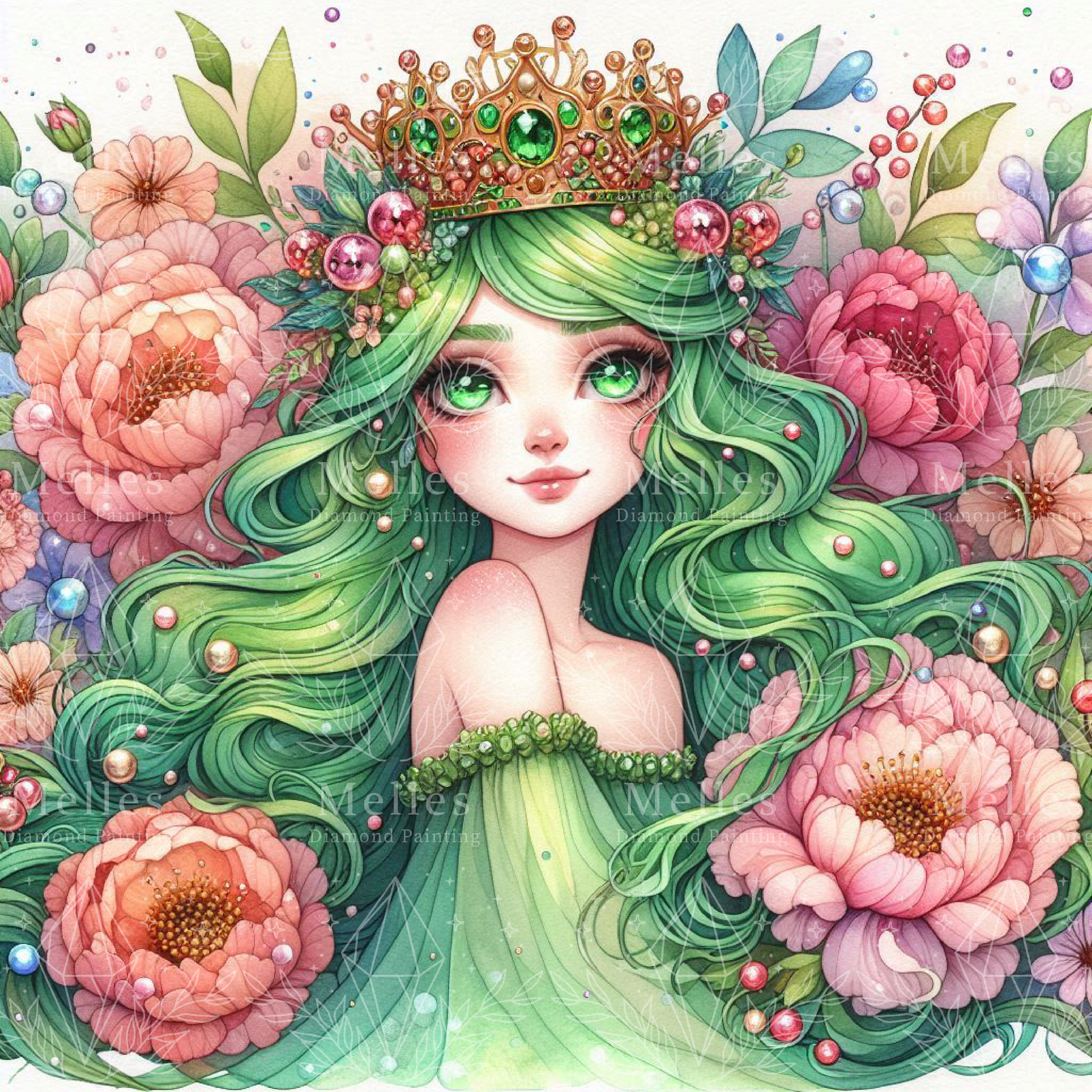 Discover the enchanting allure of "Sabrina," a captivating diamond painting kit that brings to life the beauty and grace of Sabrina, a princess with flowing green hair adorned with delicate floral accents.