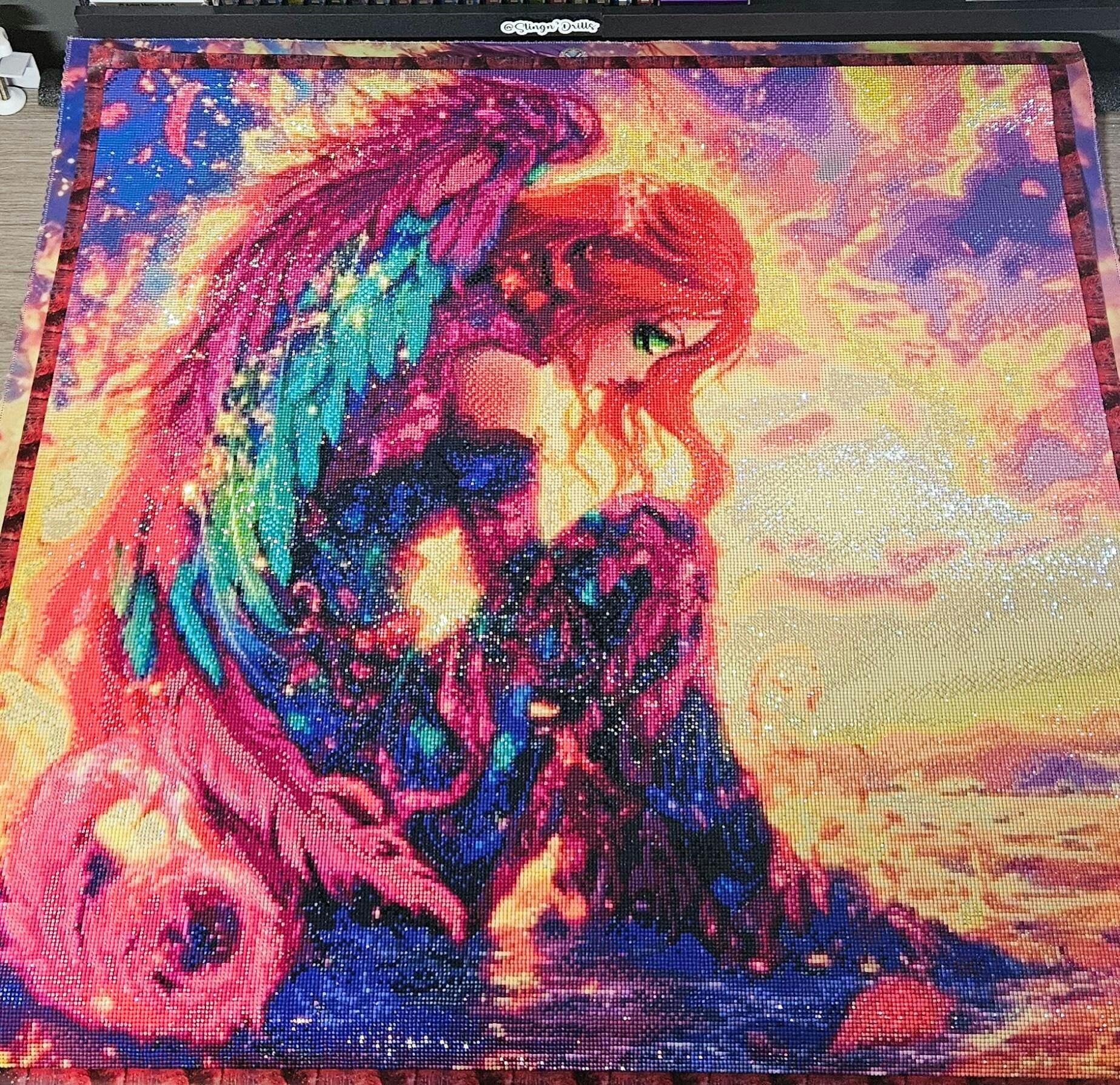 Bathed in the golden blaze of sunrise, she kneels where ocean meets fire—her feathers flickering like embers, her sorrow radiant. Every thread of her celestial armor glows with molten hues of pink, amethyst, and sapphire, as if stitched by stars and scorched by memory. She is a fallen flame, a warrior of heartbreak and dawn, carrying the final spark of a love that could ignite the sky.