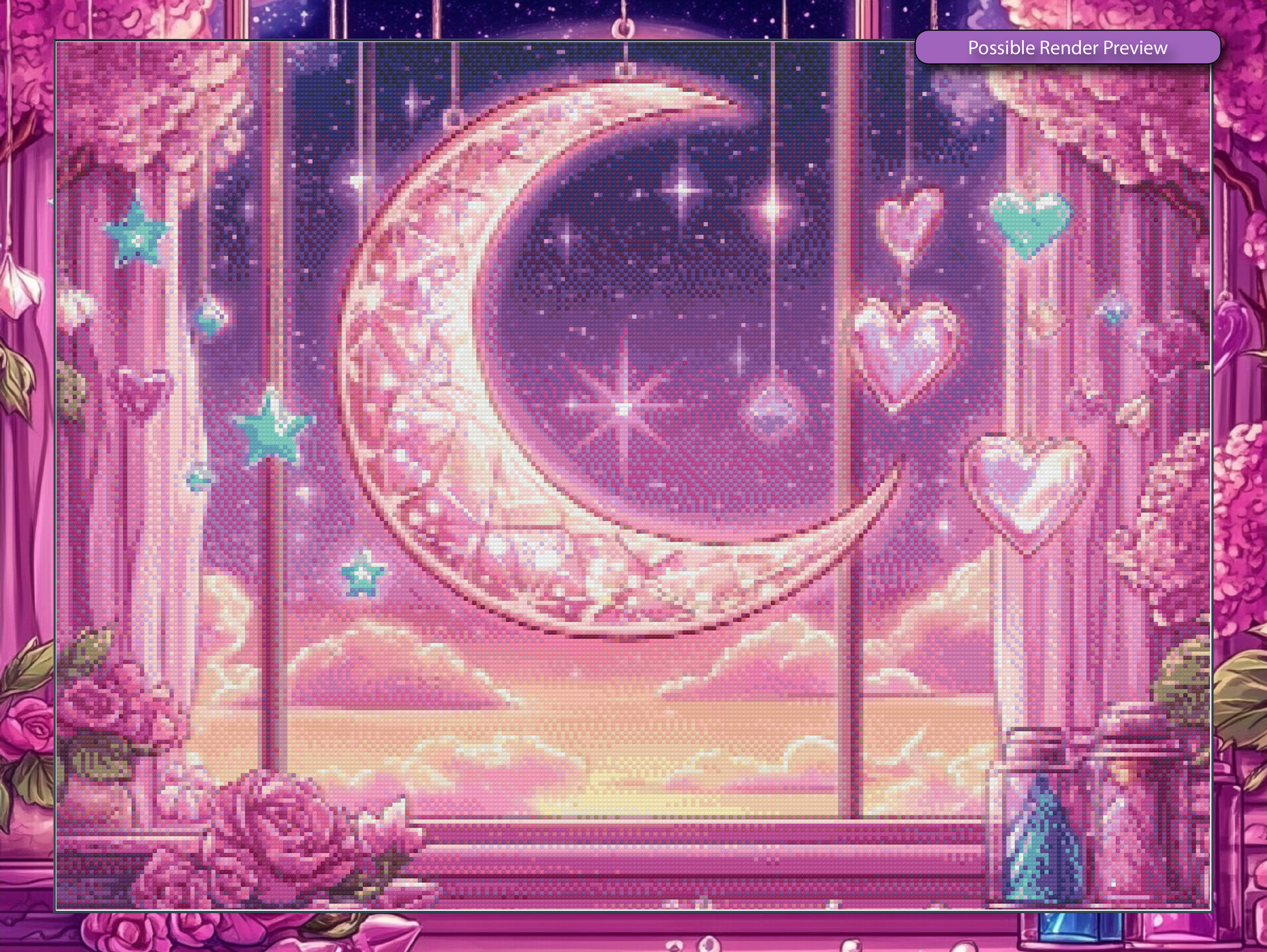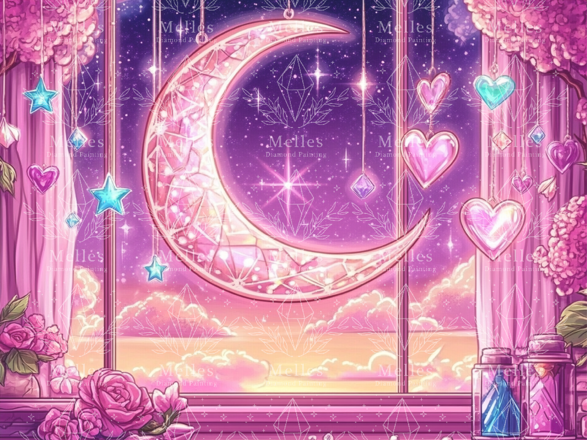A cascade of stars and crystal hearts dangle gently from the velvet sky, framed by blush curtains and blooming roses. The crescent moon glows like faceted glass, catching the last golden blush of sunset as twilight paints the world in magic. In this quiet sanctuary, every sparkle is a secret, every shimmer a soft whisper of love and wonder. ๐ธโจ๐ซ