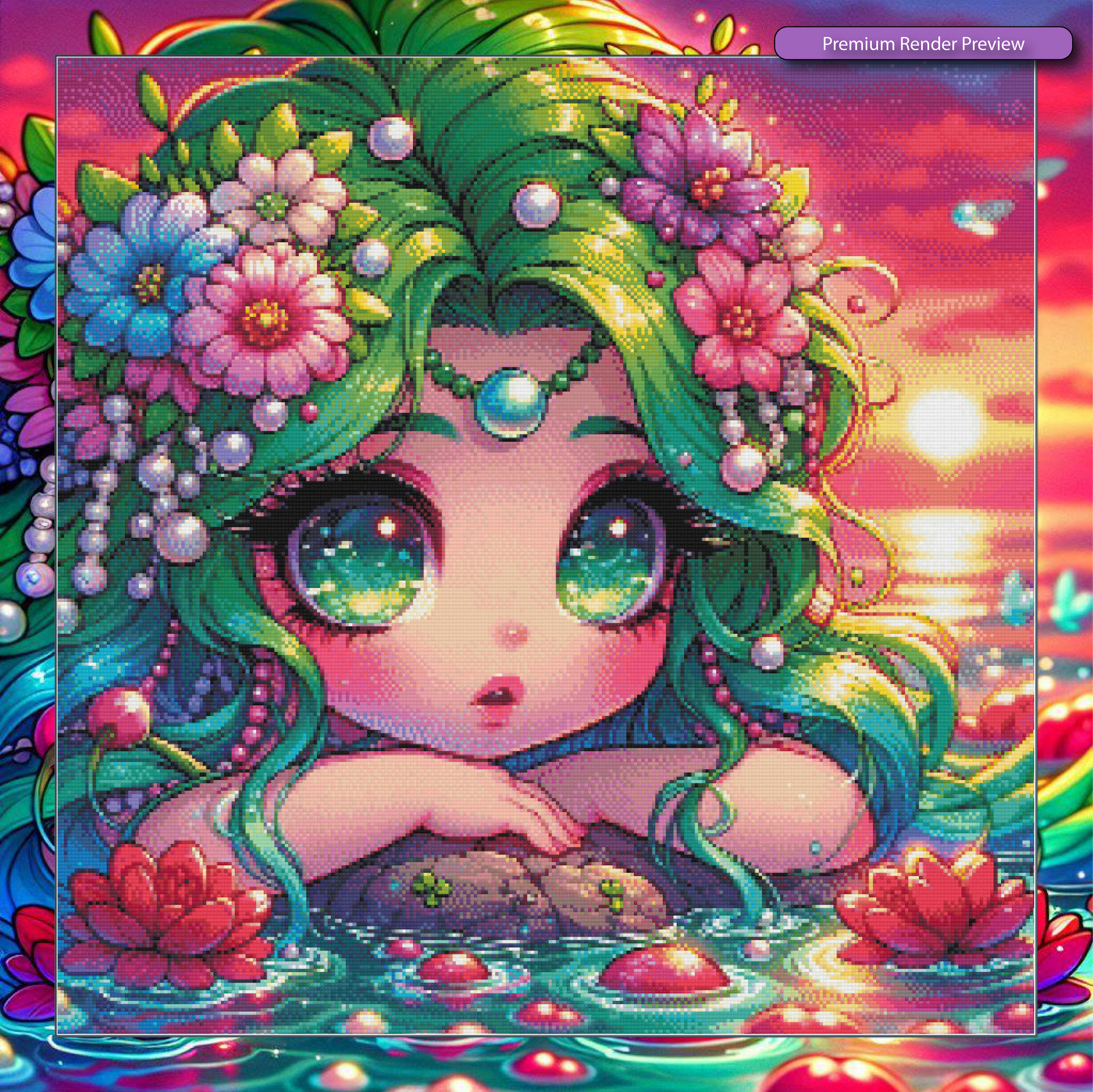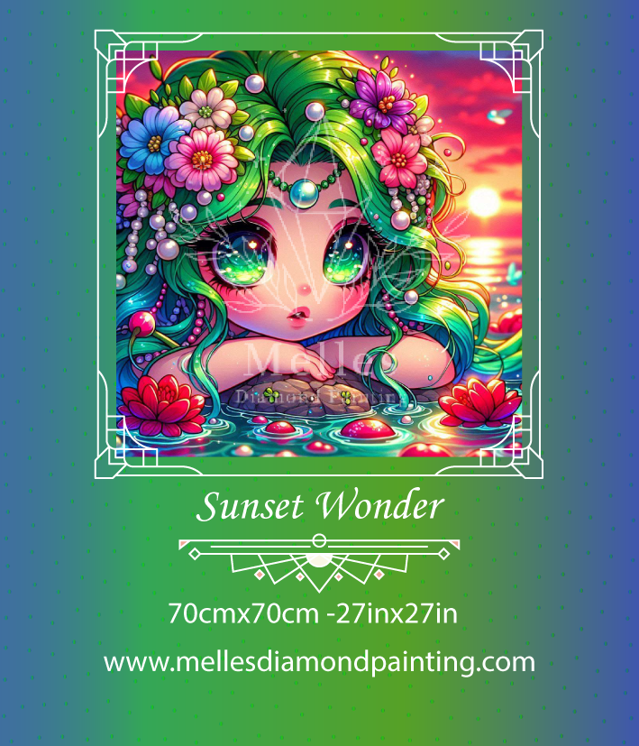 Bathed in the last kiss of daylight, Sunset Wonder is the spirit of gentle endings and hopeful beginnings. Her emerald eyes hold the reflection of skies turning gold to rose, a reminder that magic lives in every quiet moment of change. Flowers crown her thoughts, pearls carry her wishes, and the water listens as she dreams.