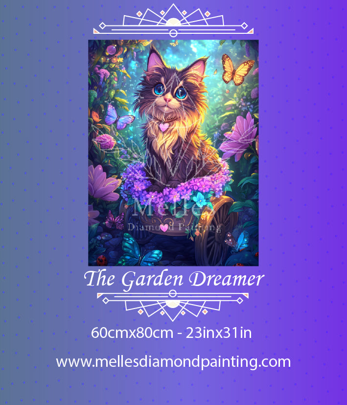 Nestled in a blooming cart of lilac dreams, this wide-eyed feline gazes skyward, where butterflies waltz on beams of morning light. With fur kissed by twilight and dawn, and a heart-shaped pendant glowing softly at her chest, she is more than a kitten — she is a keeper of whispers, a wanderer of wishes.