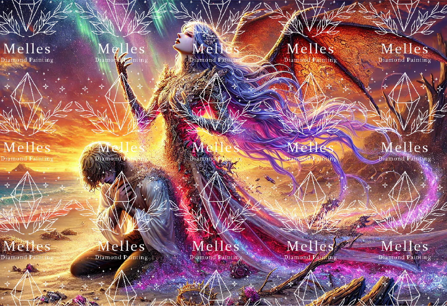 Her wings of twilight spread wide, catching the dying light of the sun as her body shifts between mortal and celestial, a force both destructive and divine. The warrior at her feet kneels, caught between devotion and despair, his fate bound to the goddess who now stands before him.