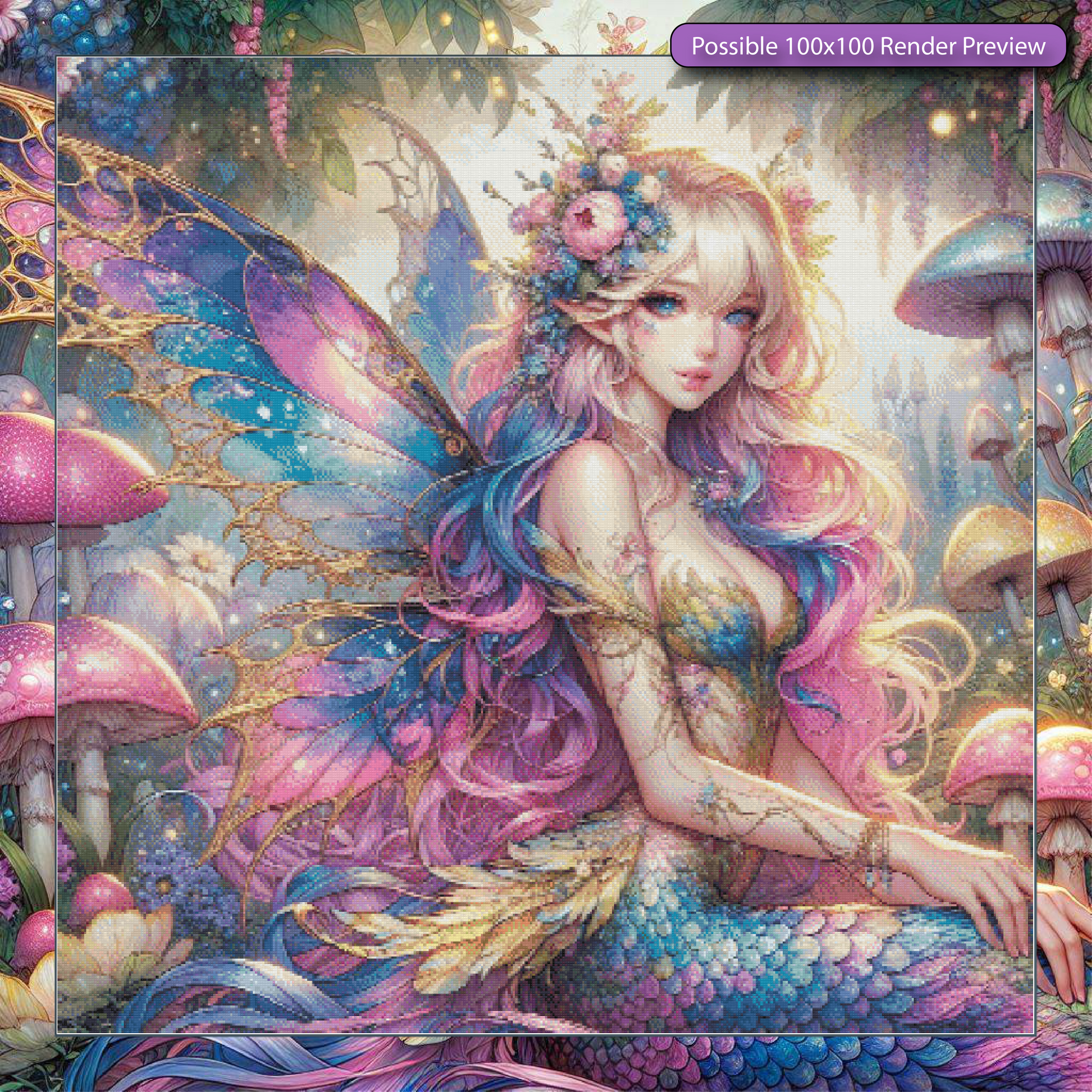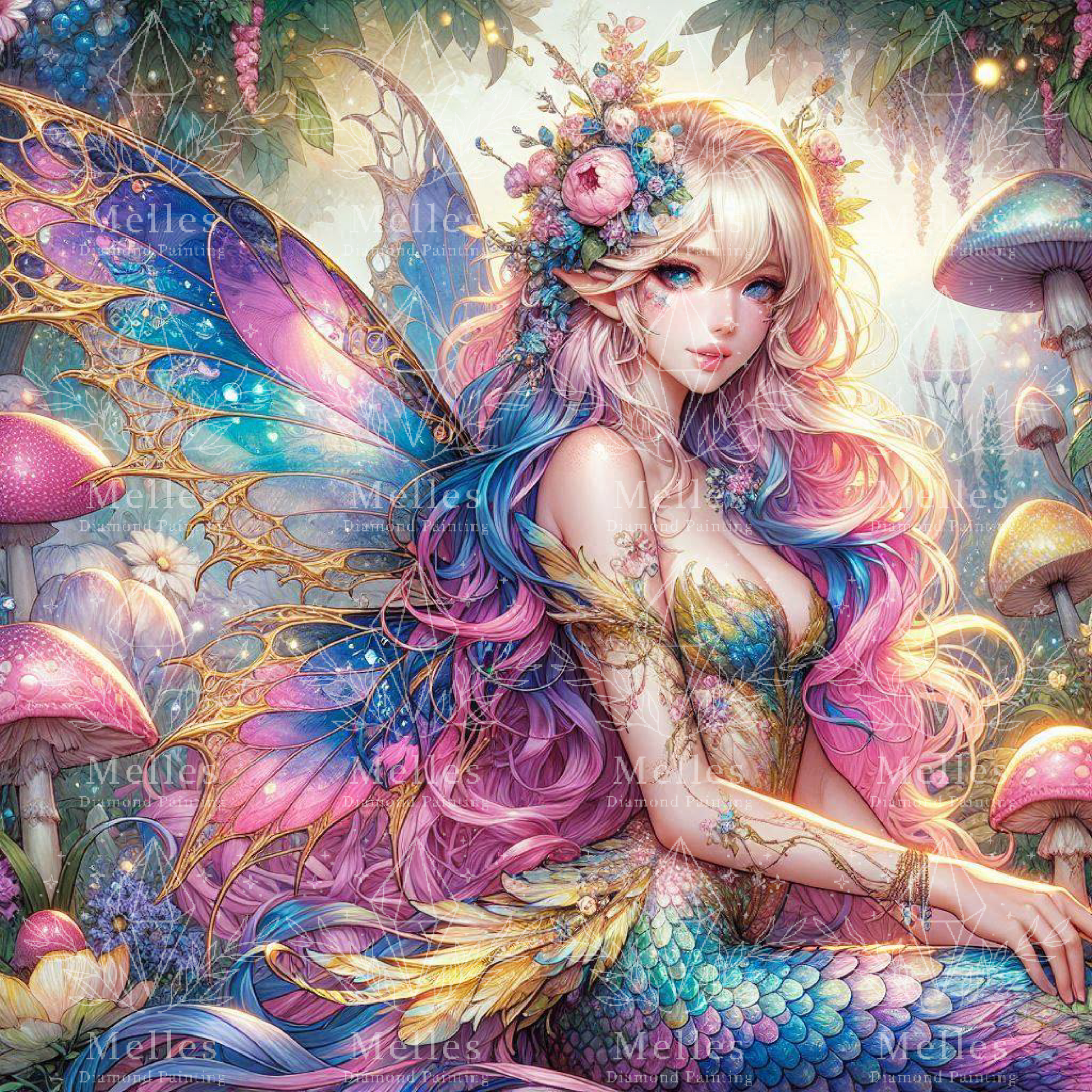 Bathed in the glow of enchanted wings, she is the gentle light that guides through dreamlike forests. Blossoms crown her, and her spirit shimmers with the colors of dawn and dusk.