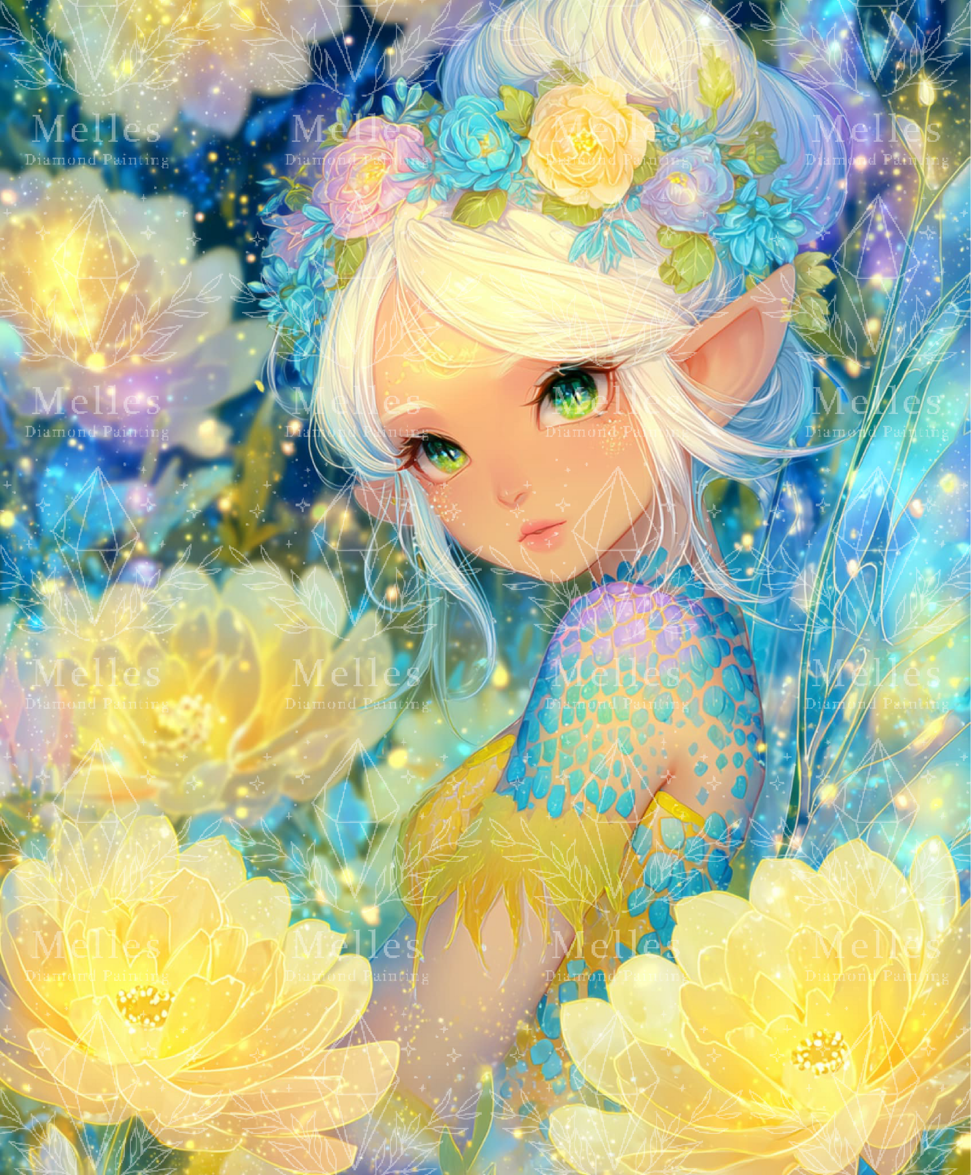 A delicate spirit blooming among golden flowers, her scales shimmer with the hues of dawn. Guardian of blossoms, she carries the quiet promise of renewal. 🌿🌸