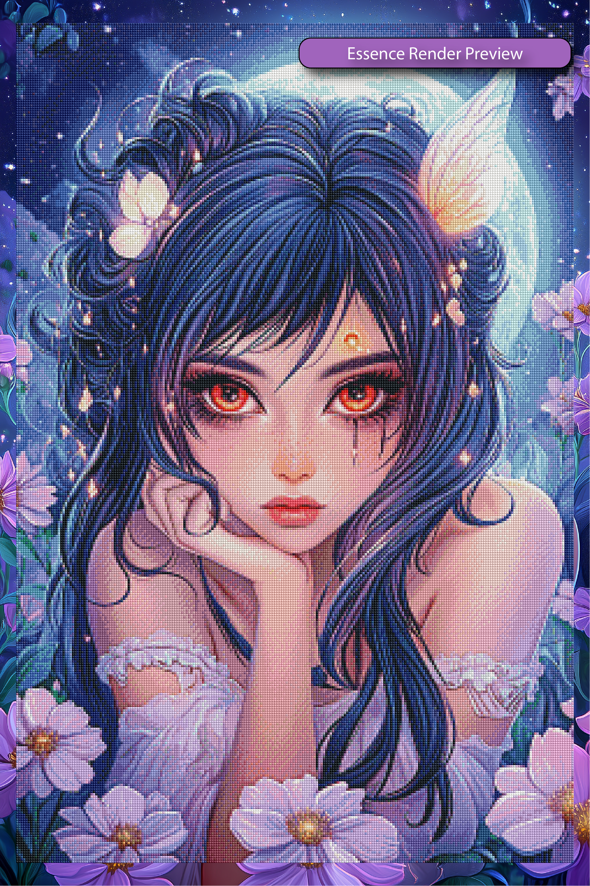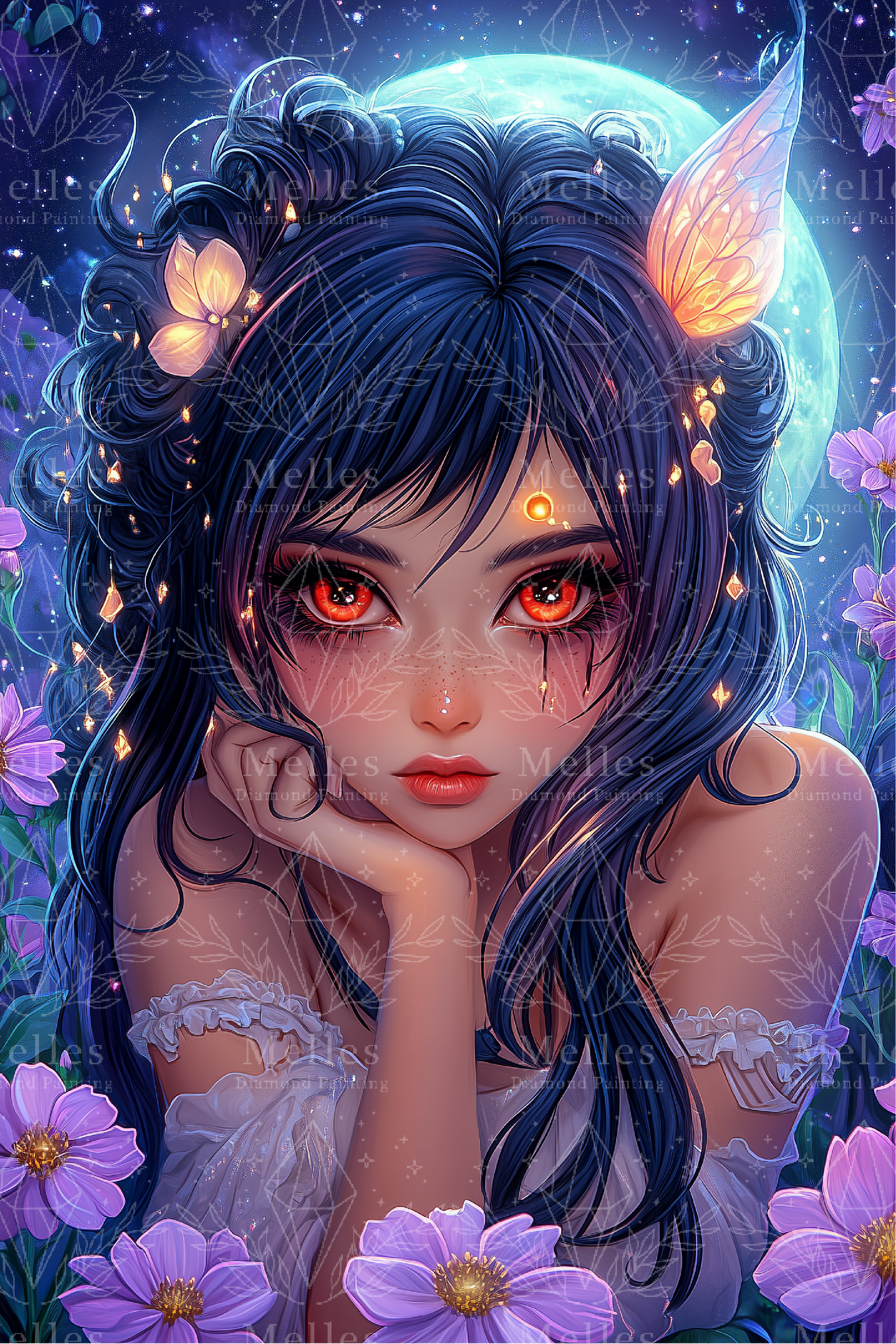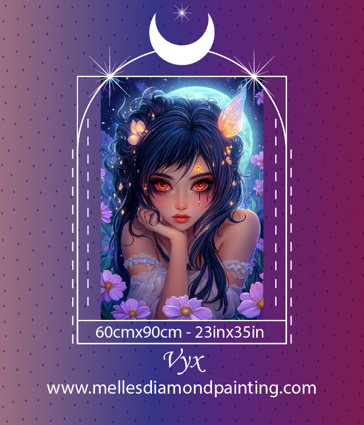 With eyes like burning embers beneath the moonlight, Vyx is the enchantress of twilight dreams. Her raven-dark hair glows with firefly sparks, crowned by ethereal wings that shimmer in shades of dawn and dusk. Surrounded by blooming nightflowers, she holds the quiet intensity of a thousand secrets โ a spirit of passion, mystery, and starlit magic.