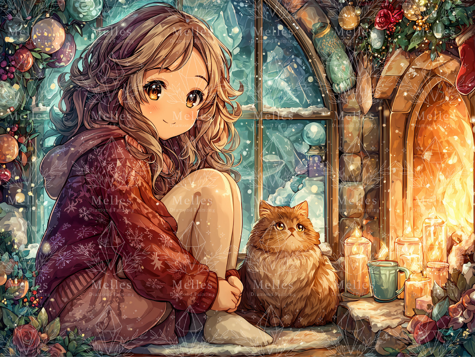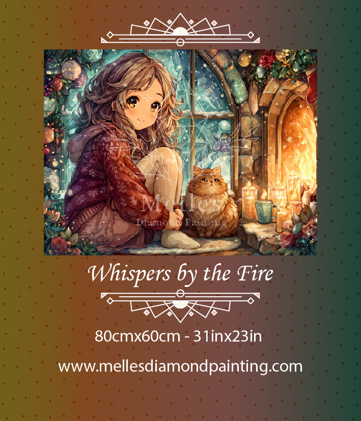 Wrapped in the gentle glow of candlelight, Whispers by the Fire captures a moment of cozy peace. A girl and her fluffy companion share the warmth of winter’s hush, where the world outside glistens in snow and the fire hums its golden lullaby. 🍂🕯️