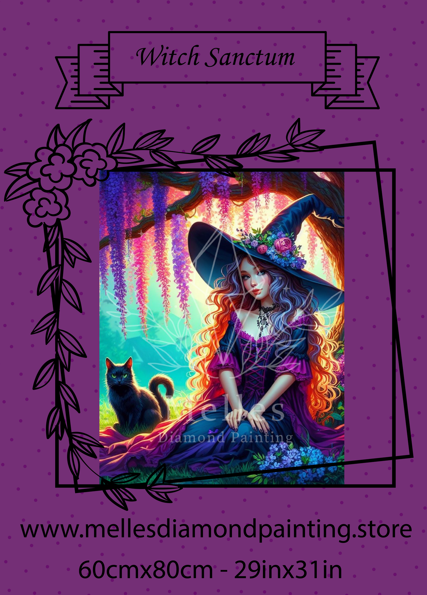 Unveil the magic of twilight in your very own home with our bewitching diamond painting. At the heart of this mystical tableau is an elegant witch, her identity shrouded in mystery, seated beneath the enchanting drapery of wisteria vines. Her attire is a tapestry of rich purples and pinks, with intricate ruffles and lacing that promise to shimmer with every placed diamond. Adorning her hat, a floral arrangement whispers tales of ancient gardens and secret spells.